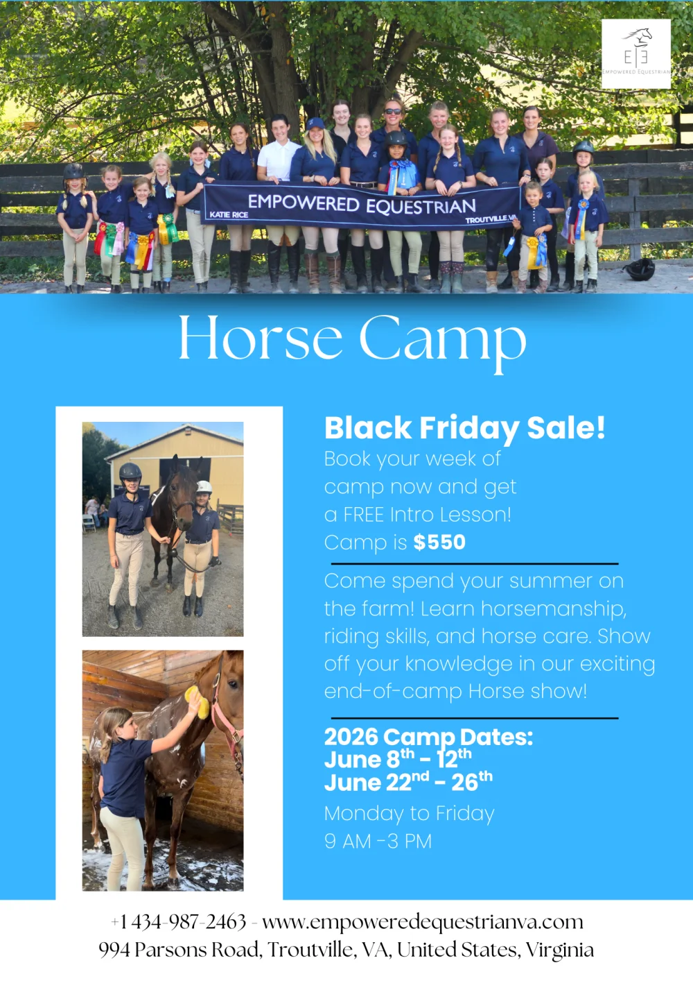 Come spend your summer on the farm! Learn horsemanship, riding skills, and horse care. Show off your knowledge in our exciting end-of-camp Horse show!